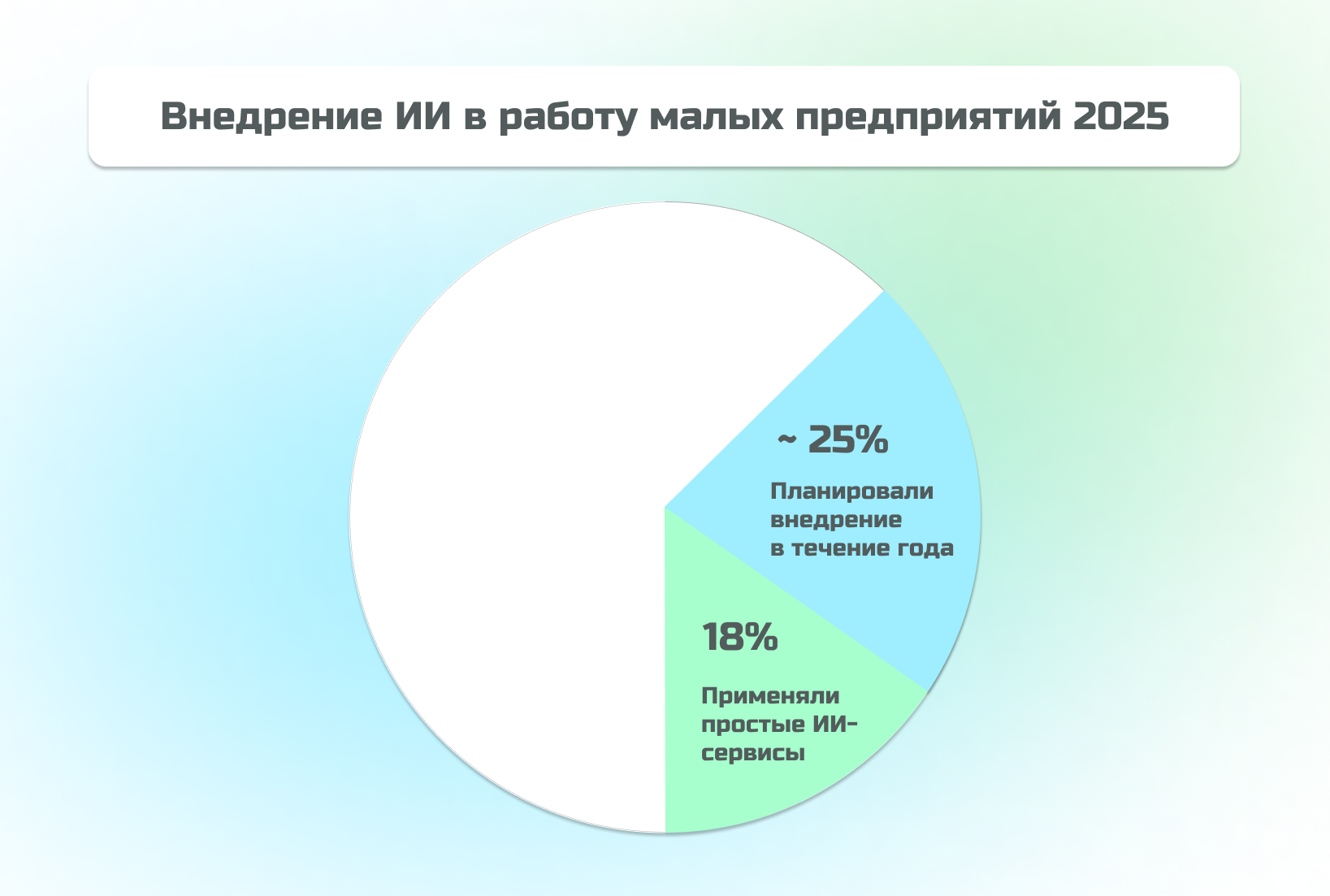Переломным стал 2025 год. По данным Summit Group, на начало марта 18% малых и микропредприятий уже применяли ИИ-сервисы, а ещё четверть планировали внедрение в течение года. По сравнению с 7% в 2024 году рост более чем двукратный — именно в этот период использование искусственного интеллекта в малом бизнесе приобрело массовый характер.