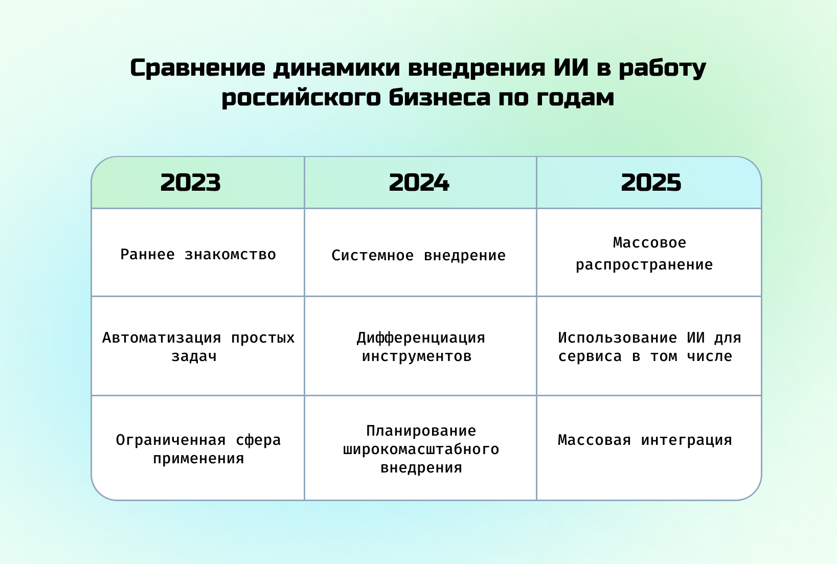 1. Искусственный интеллект в малом и среднем бизнесе прошел путь от точечных экспериментов до прикладного инструментария. Если в 2023 году нейросети использовались преимущественно в маркетинге, то к 2025 году они стали частью повседневной работы компаний.