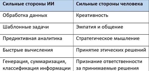 При этом важно искать точки достижения максимального эффекта от такого «симбиоза». Для этого важно понимать, в чем сильные стороны ИИ, а в чем сильные стороны человека: