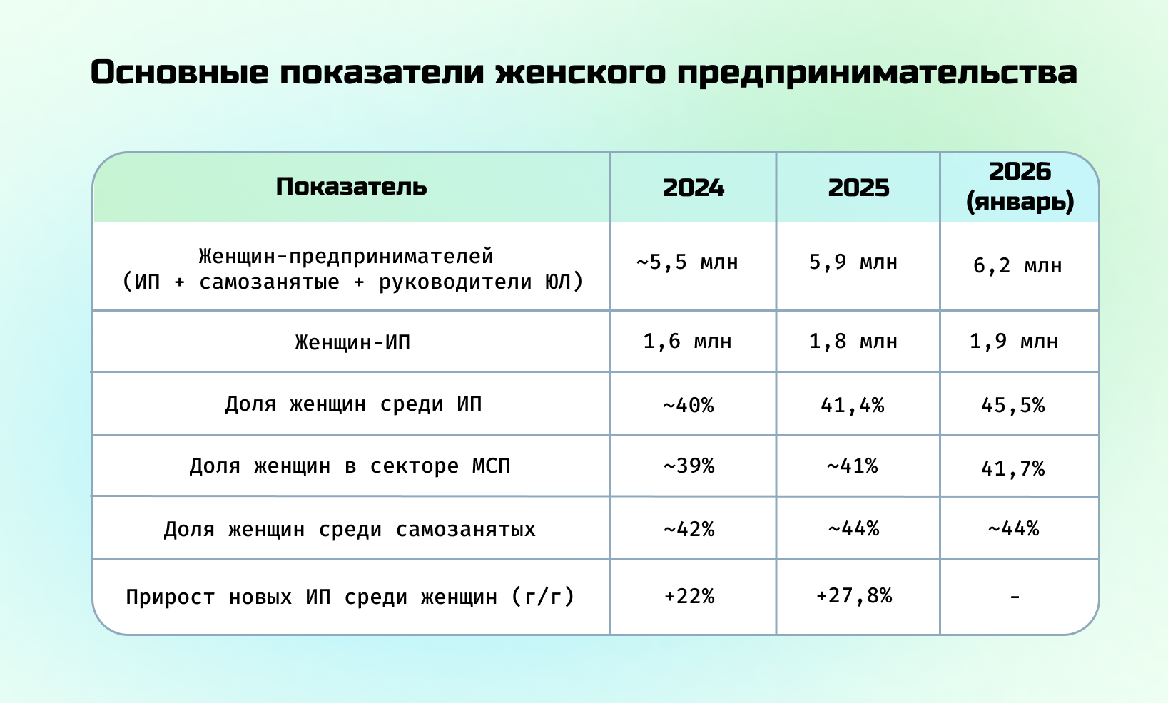 Женское предпринимательство в России показывает прирост, сохраняя темп в условиях налоговых реформ и геополитических изменений. К январю 2026 года численность женщин в бизнесе достигла 6,2 млн человек.
