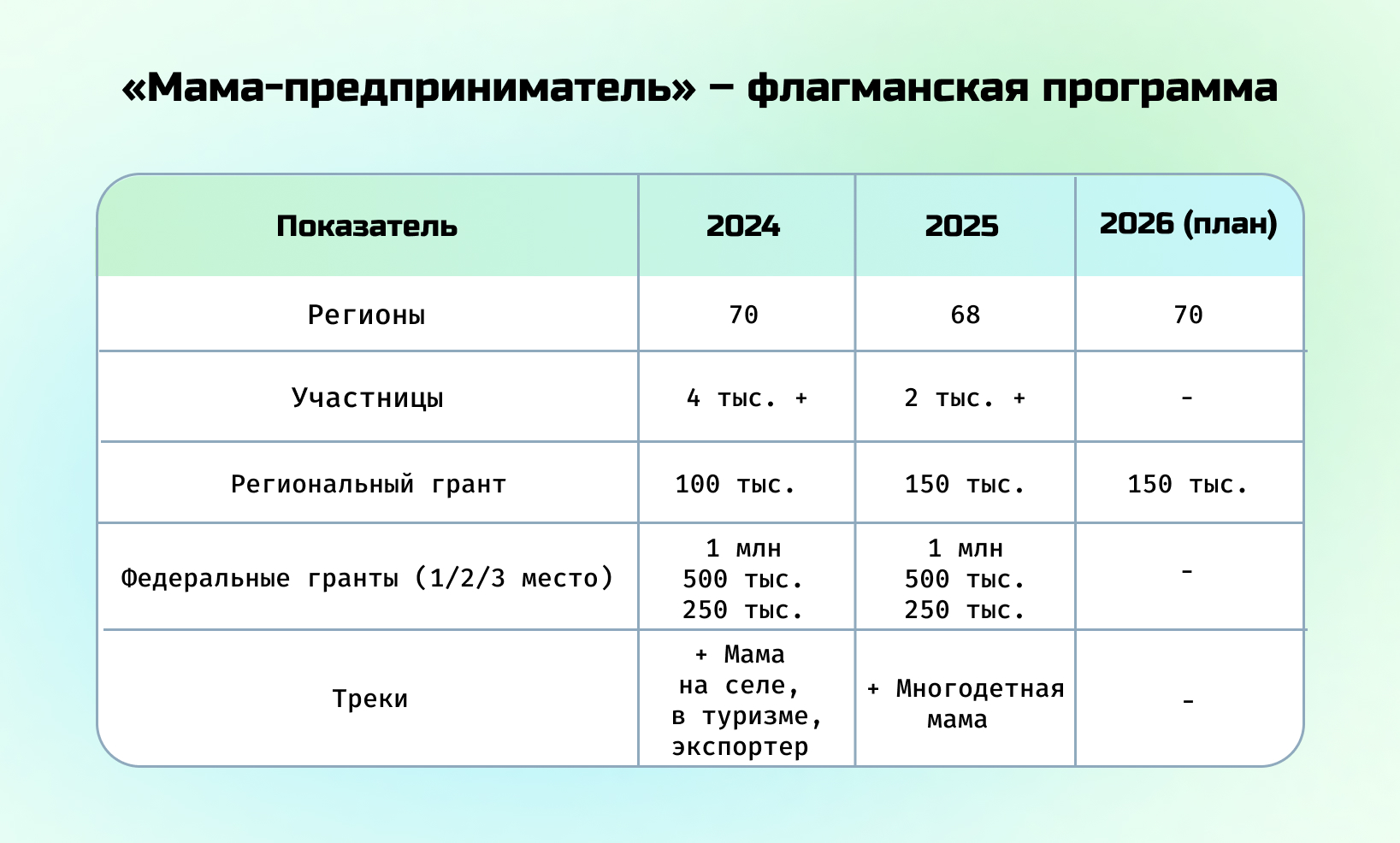 Дистанционная программа «ПредприниМАМА» запущена в 2024 году и разработана для тех, кто ищет идею для старта. В первый год проведения на нее поступило 6 тыс. заявок, из которых около 1 тыс. завершили обучение. В 2025 году поступило более 5 тыс. заявок. В 2026 году обучение началось и в офлайн-формате.