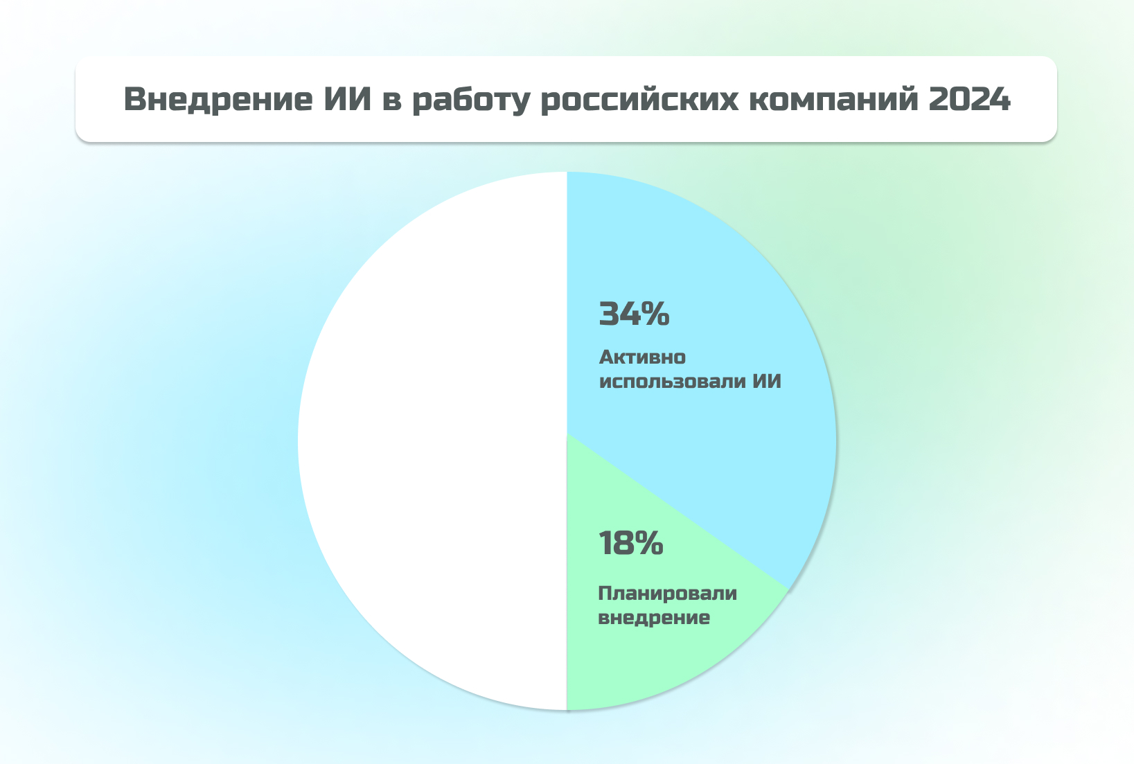 В 2024 году внедрение ИИ стало более системным. Исследование ComNews зафиксировало, что около 34% российских компаний уже активно использовали искусственный интеллект, а еще 18% планировали внедрение в ближайшее время. Технология перестала восприниматься только как маркетинговый инструмент.